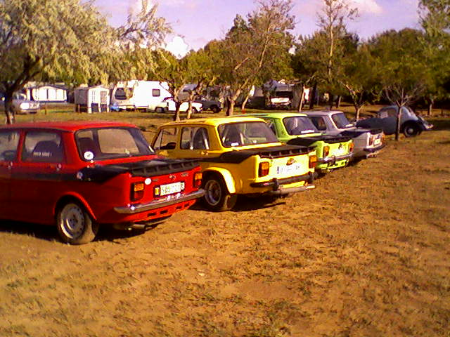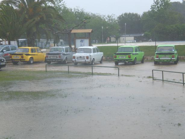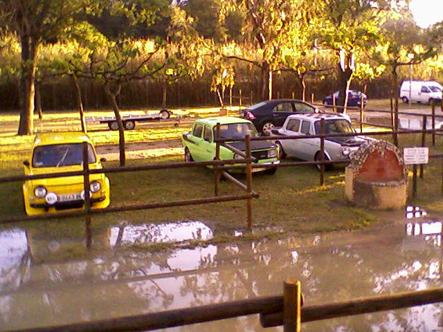 Podría resumir los tres días en los que asistí a la concentración internacional Simca en Tarragona con una sola palabra "AGUA" pero me quedaría corto y añadiré dos mas "Mucha agua" Aun así seguiría faltando a la realidad de dicho acontecimiento por dos razones fundamentales, la primera por que fuimos victimas de un temporal que sin piedad casi deshizo todas nuestras expectativas de diversión por nuestra afición a los Simcas y lo que el Meeting de Tarragona significaba para todos nosotros, aun así el desanimo, la frustración y la impotencia de ver como lo meteorológico no nos daba tregua conseguimos juntar todas nuestras fuerzas y dedicarnos a lo nuestro, así que con lluvia o sin ella 15, 20 o 30 personas caladas hasta los huesos rodeadas de de nuestros coches hablábamos y hablábamos sin parar de nuestra afición, unos con paraguas otros sin el pero allí estábamos, personas que no nos conocíamos excepto por esta Web. La segunda es que allí, en medio de la lluvia y del viento que no paraba, he descubierto corazones que estoy seguro que se pararían si por un momento perdieran su Simca 1000 que cuidan, restauran y miman en sus cocheras también personas que tiene su corazón roto por que les falta, curiosamente yo era una persona que creía que la afición que tenia era única, que nadie mas la entendería y que podría ser hasta una tontería, e visto que todo eso no era así por que muchas personas me han agradecido la iniciativa que tuve al hacer esta pagina Web. Muchas gracias a todos no sabia que para algunas personas fuese tan importante esta afición. Los Hechos: Como ya dije salimos de Vallirana a las 4:30 solo éramos mi hermano y yo puesto que el resto salíamos escalonados, unos un día antes y otros después, los 50Km que nos separaban del camping los hicimos bajo la lluvia sin ningún percance ni problema, cuando llegamos todavía no se había inundado la entrada del camping esto ocurriría un día mas tarde pero la cosa estaba cerca puesto que no dejaba de llover y la cosa pintaba muy negra, nos registramos y descargamos los coches en el bungaló deseando salir para ver que nos deparaba el acontecimiento, nos fuimos hacia el bar. del centro del camping y allí nos encontramos con Manuel Rey al cabo de unos 15 minutos empezaron a llegar los simqueros Alfredo y Amaya Jordi con su hermano después llego Juan con su señora todos aficionados hasta la medula no tardamos en salir bajo la lluvia a comentar delante de nuestros coches, nos daba igual la lluvia en esos momentos casi ni la notábamos, lo pasamos muy bien todos juntos, después nos metimos en el bar y no paraban de llegar mas Simqueros, Alfredo saco su ordenador portátil y nos enseño su joya un Simca 1000 que estaba restaurando. Al cabo de una hora aprox. salimos para ver lo que tenia montado la organización, pero era tal la cantidad de agua caída que no se pudo montar el evento como se debía así que se hizo lo que se pudo.