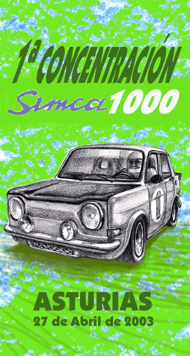 Nuestra representación con Simca 1000 queda patente en estas fotografías. Fijaros en la compañera Hippie que va en este 127 Haber quien adivina como se a hecho esta pintada al coche del S.r.Guillermo Después todos los asistentes a esta quedada seremos invitados a comer gratis a sendos restaurantes, nadie se quedo con hambre. Un saludo a los organizadores y en hora buena hasta la próxima.. Cartel diseñado por: Javier Ruisanchez www.ilustrismo.com 1ª Concentración Simca 1000 Asturias 2003 Por fin llego el día de la Concentración, todos esperábamos que el día acompañase con un sol radiante y lo hizo, poco a poco fueron llegando los Simcas al punto de encuentro, había para todos los gustos y colores, casi todos Rallyes, con aletines, sin aletines, con carburación, sin carburación, ósea a cual más preparado.
